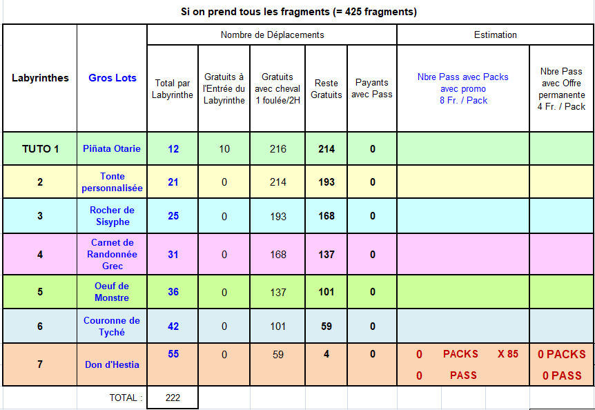 - Sur le parcours des labyrinthes on gagne au maximum 425 fragments + 20x15 fragments objectifs = 425 + 300 = 725
