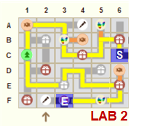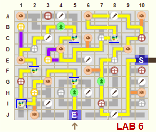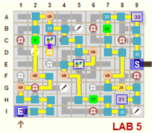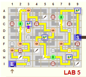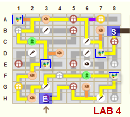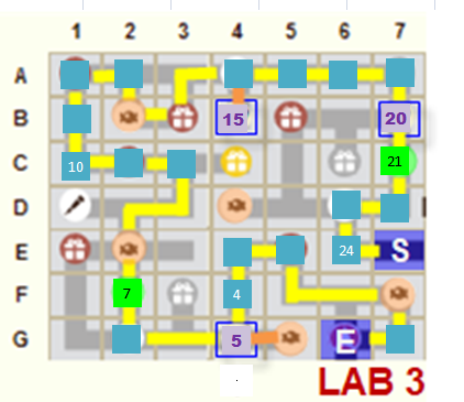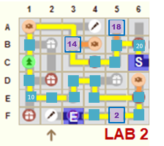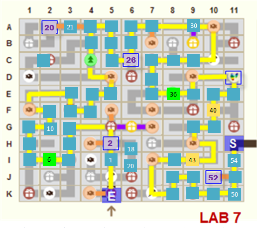 Ne pas faire plus de 2 déplacements pour prendre une friandise à côté du tracé jaune ▇▇ - aller/retour = tracé orange ▇▇